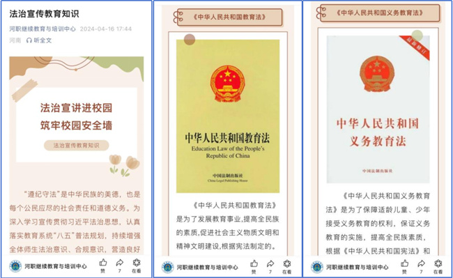 學(xué)校各部門、各二級學(xué)院也紛紛開展了學(xué)習(xí)研討、繪制海報、主題班會等形式多樣的法治教育宣傳活動,并圍繞憲法、國家安全、預(yù)防青少年犯罪等相關(guān)主題,通過學(xué)校網(wǎng)站、微信公眾號等平臺推送法律知識,引導(dǎo)全校師生將“學(xué)法、知法、守法”內(nèi)化于心,外化于行。