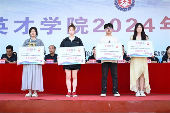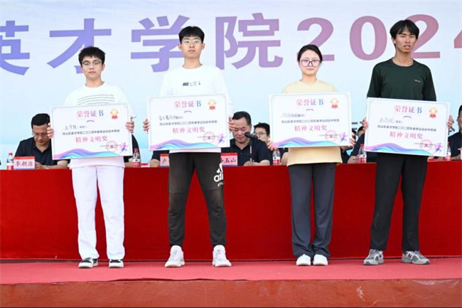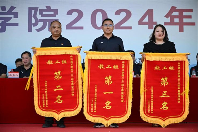 閉幕式上,裁判長(zhǎng)宣讀比賽成績(jī)。經(jīng)過(guò)激烈角逐,音樂(lè)舞蹈學(xué)院、商學(xué)院、工學(xué)院獲得學(xué)生團(tuán)體總分前三名;機(jī)關(guān)一代表隊(duì)、山東英才學(xué)院高級(jí)技工學(xué)校、學(xué)前教育學(xué)院獲得教工團(tuán)體總分前三名;商學(xué)院、學(xué)前教育學(xué)院、音樂(lè)舞蹈學(xué)院、工學(xué)院獲得2024年春季運(yùn)動(dòng)會(huì)體育精神文明獎(jiǎng);醫(yī)學(xué)院、設(shè)計(jì)學(xué)院、北校區(qū)綜合管理辦公室代表隊(duì)、機(jī)關(guān)2代表隊(duì)獲得2024年春季運(yùn)動(dòng)會(huì)體育道 獎(jiǎng)。隨著頒獎(jiǎng)音樂(lè)響起,各代表團(tuán)代表依次上臺(tái)領(lǐng)獎(jiǎng),他們的臉上洋溢著激動(dòng)和自豪的笑容。這些獎(jiǎng)項(xiàng)不僅是對(duì)他們辛勤付出的肯定,更是對(duì)他們團(tuán)隊(duì)精神和集體榮譽(yù)感的彰顯。