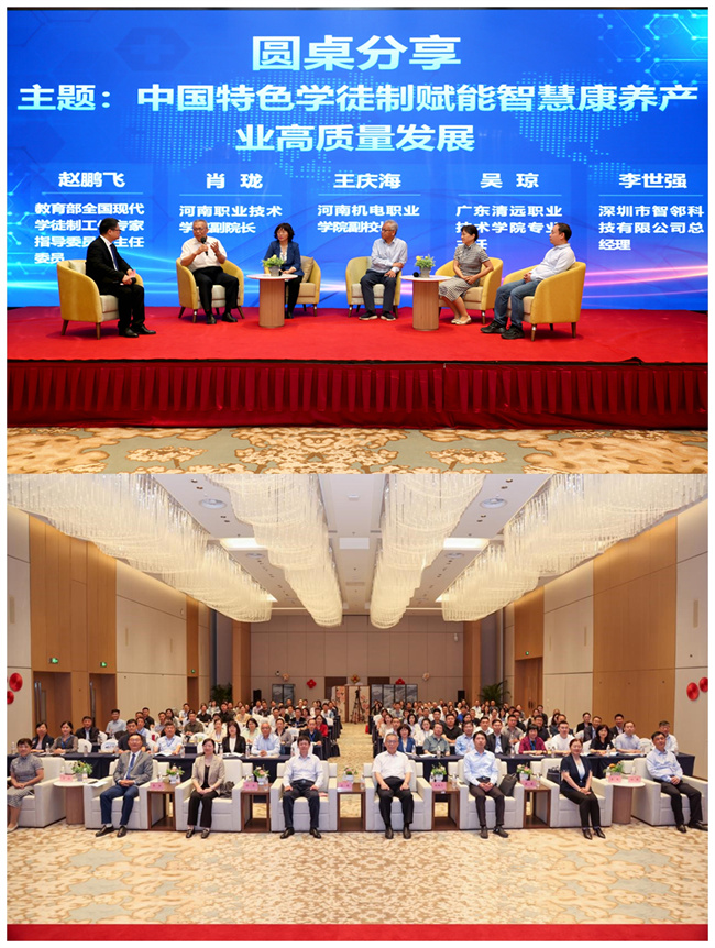 成立儀式后,趙鵬飛作《中國特色學(xué)徒制的實踐與思考》主旨報告;隨后,趙鵬飛、吳瓊與河南職業(yè)技術(shù)學(xué)院副校長肖瓏、河南機電職業(yè)學(xué)院副校長王慶海、深圳市智鄰科技有限公司總經(jīng)理李世強以“中國特色學(xué)徒制賦能智慧康養(yǎng)產(chǎn)業(yè)高質(zhì)量發(fā)展”為題進行了圓桌分享。