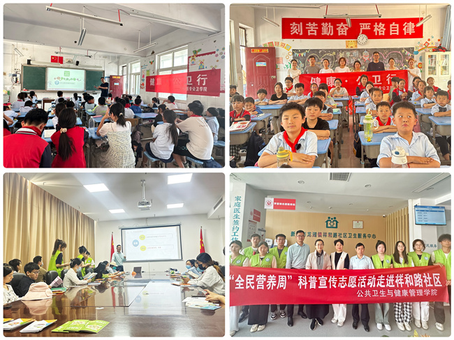 同時(shí),本次活動(dòng)還走出校園,開展了營養(yǎng)教育“進(jìn)學(xué)校、進(jìn)社區(qū)”志愿服務(wù)活動(dòng)。公共衛(wèi)生與健康管理學(xué)院教師在泰山小學(xué)開展《知“食”就是力量》營養(yǎng)健康教育,分享營養(yǎng)健康知識(shí),鼓勵(lì)學(xué)生從小培養(yǎng)健康飲食行為,提升營養(yǎng)健康素養(yǎng)。公共衛(wèi)生與健康管理學(xué)院志愿服務(wù)隊(duì)走進(jìn)祥和路社區(qū)衛(wèi)生服務(wù)中心開展志愿服務(wù),并邀請(qǐng)杜松明研究員和學(xué)院營養(yǎng)專業(yè)師生共同宣傳母嬰營養(yǎng)健康教育,開展“媽媽課堂”講述《乳母和嬰幼兒膳食》,為“新”爸爸和“新”媽媽合理喂養(yǎng)“新”寶寶、保障正常生長(zhǎng)發(fā)育出謀劃策。