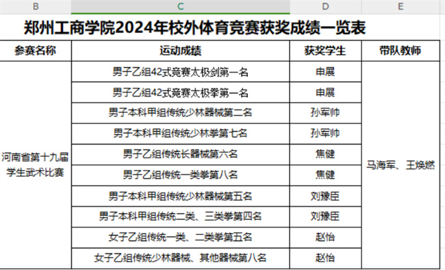 本屆比賽吸引了來自省內(nèi)80所高校、近千余名運(yùn)動(dòng)員和教練員參賽,是省內(nèi)高校間級(jí)別最高、規(guī)模最大、影響力最廣的武術(shù)賽事。在校領(lǐng)導(dǎo)和學(xué)院的關(guān)懷與支持下,鄭州工商學(xué)院武術(shù)代表隊(duì)選派6名運(yùn)動(dòng)員,在馬海軍、王煥燃老師的帶領(lǐng)下,分別參加了12個(gè)單項(xiàng)比賽,共獲獎(jiǎng)十項(xiàng)。比賽中,運(yùn)動(dòng)員們用頑強(qiáng)拼搏的精神、高超的技術(shù),展示了該校學(xué)子健康自信、團(tuán)結(jié)向上的陽(yáng)光形象,為該校樹立了良好的口碑、贏得了贊譽(yù)。
