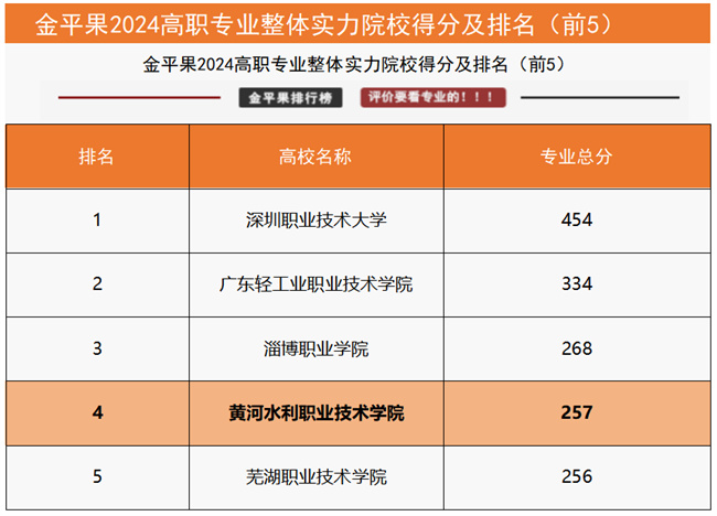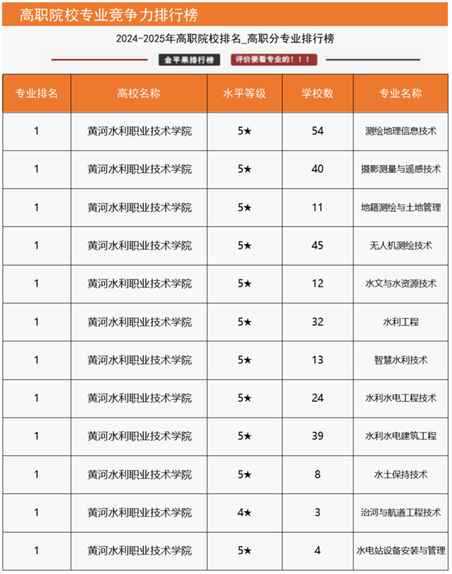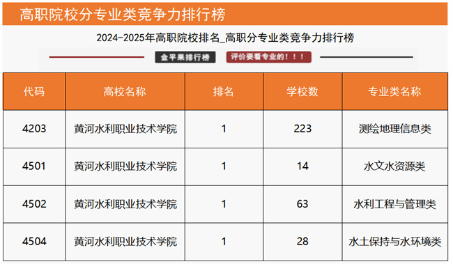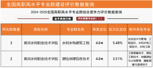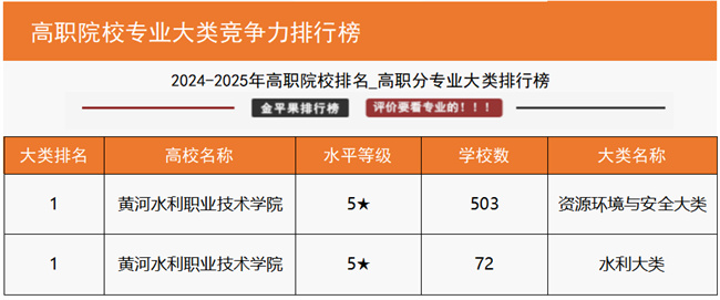 “國家級高水平專業(yè)群綜合競爭力評價”數(shù)據(jù)顯示,黃河水利職業(yè)技術學院水利水電建筑工程專業(yè)群、測繪地理信息專業(yè)群2個高水平專業(yè)群上榜入圍,在同類專業(yè)群中位列全國第一;“高職院校分專業(yè)大類競爭力排行榜”數(shù)據(jù)顯示,該校資源環(huán)境與安全大類、水利大類2個分專業(yè)大類均位列全國第一;“高職院校分專業(yè)類競爭力排行榜”數(shù)據(jù)顯示,該校測繪地理信息類、水文水資源類、水利工程與管理類、水土保持與水環(huán)境類4個專業(yè)類均位列全國第一;“高職院校專業(yè)競爭力排行榜”數(shù)據(jù)顯示,該校14個專業(yè)上榜,其中測繪地理信息技術、攝影測量與遙感技術、地籍測繪與土地管理、無人機測繪技術、水文與水資源技術、水利工程、智慧水利技術、水利水電工程技術、水利水電建筑工程、水土保持技術、水電站設備安裝與管理、治河與航道工程技術12個專業(yè)位列全國第一,測繪工程技術、水生態(tài)修復技術2個專業(yè)位列全國第二,土木工程檢測技術、環(huán)境檢測技術2個專業(yè)位列全國第三。