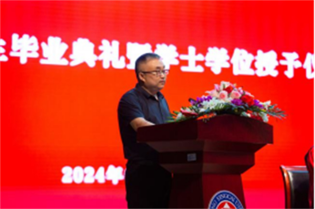 校長張星臣以《無懼風(fēng)雨路 奔赴新征程》為題發(fā)表致辭,深情寄語2024屆畢業(yè)生要有矢志不渝、愛國為民的家國情懷,以廣闊的國際視野和深摯的家國情懷思考規(guī)劃自己的未來,堅定地把個人奮斗融入強(qiáng)國建設(shè)、民族復(fù)興的時代洪流之中;要有篤行不輟、恒必有成的堅定信念,腳踏實地,在不斷地積累和奮斗中打牢根基,厚積薄發(fā);要有勤學(xué)善學(xué)、終身學(xué)習(xí)的人生追求,既向書本學(xué)習(xí),還要知行合一,深入實踐,使自己真正成為“行家里手”。