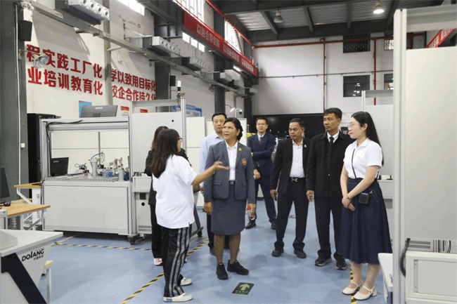 結(jié)業(yè)典禮后,泰國素叻他尼職業(yè)技術(shù)學(xué)院校長班查菈·樂薩瓦及其團(tuán)隊(duì)參觀了學(xué)校實(shí)訓(xùn)室和實(shí)習(xí)工廠。對(duì)學(xué)校設(shè)施完備的實(shí)習(xí)實(shí)訓(xùn)環(huán)境,班查菈·樂薩瓦一行表示深感震撼,并表達(dá)了將更多泰國學(xué)生派送到學(xué)校進(jìn)行學(xué)習(xí)與交流的愿望。