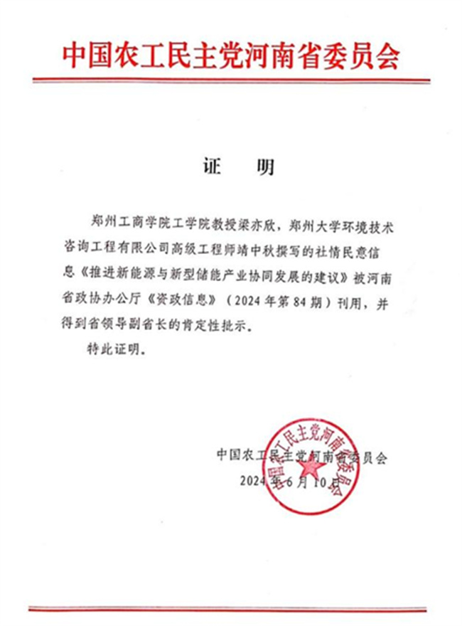 中新河南網(wǎng)7月22日電(梁亦欣) 近日,鄭州工商學(xué)院收到農(nóng)工黨河南省委會發(fā)來的賀信和證明,由該校工學(xué)院梁亦欣教授牽頭調(diào)研并主筆撰寫的調(diào)研報告《深化能源領(lǐng)域改革助力“雙碳”目標(biāo)實現(xiàn)》上報中共河南省委后,得到主要領(lǐng)導(dǎo)的肯定性批示;其主筆撰寫的《推進(jìn)新能源與新型儲能產(chǎn)業(yè)協(xié)同發(fā)展的建議》被河南省政協(xié)辦公廳《資政信息》(2024年第84期)刊用,并得到省領(lǐng)導(dǎo)的肯定性批示。