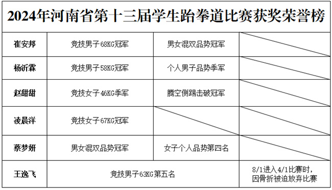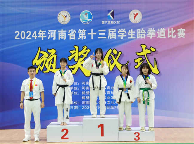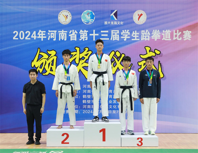 汝州職院跆拳道代表隊(duì)由陳寶利任領(lǐng)隊(duì),胡鵬、王鵬飛任教練員,6名參賽運(yùn)動(dòng)員主要參加了競(jìng)技、品勢(shì)和擊破三個(gè)項(xiàng)目的角逐。其中,崔安邦榮獲競(jìng)技男子68KG冠軍、男女混雙品勢(shì)冠軍;楊沂霖榮獲競(jìng)技男子58KG冠軍、個(gè)人男子品勢(shì)季軍;趙甜甜榮獲騰空側(cè)踢擊破冠軍、競(jìng)技女子46KG季軍;凌晨洋榮獲競(jìng)技女子67KG冠軍;蔡夢(mèng)妍榮獲男女混雙品勢(shì)冠軍、女子個(gè)人品勢(shì)第四名;王逸飛榮獲競(jìng)技男子63KG第五名。此外,王逸飛同學(xué)被評(píng)為優(yōu)秀運(yùn)動(dòng)員,胡鵬老師被評(píng)為優(yōu)秀指導(dǎo)教師。