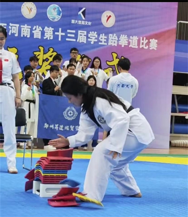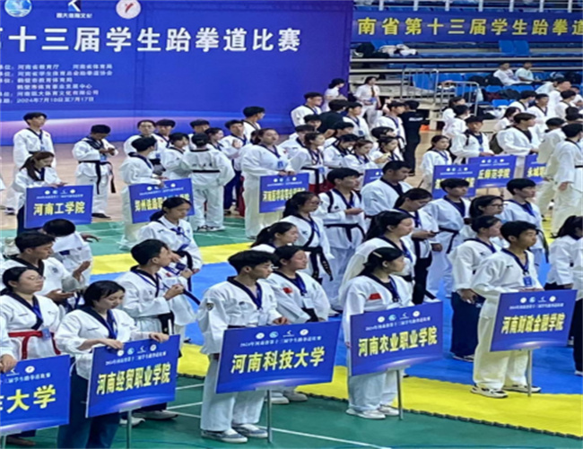 中新河南網(wǎng)7月28日電(尚華)7月13日至17日,河南省第十三屆學(xué)生跆拳道比賽在鶴壁市千鶴之舞體育館舉行,本次比賽由河南省教育廳、河南省體育局聯(lián)合主辦,共有來(lái)自河南省63所高校749名教練員、運(yùn)動(dòng)員參賽。河南農(nóng)業(yè)職業(yè)學(xué)院公共體育學(xué)院派出由7名同學(xué)組成的代表隊(duì),參加?萍捉M的激烈角逐,此次比賽由公共體育學(xué)院黨支部書記婁會(huì)俊擔(dān)任領(lǐng)隊(duì),何磊、姚利娟老師擔(dān)任教練員。