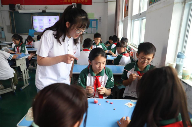 本次活動還精心設(shè)計了愛國主義教育、文化宣傳、思想引領(lǐng)、人文歷史、生物科學(xué)、素質(zhì)提升等多個領(lǐng)域的課程,旨在通過多樣化的教學(xué)內(nèi)容,激發(fā)孩子們的學(xué)習興趣,拓寬視野,播撒愛與希望的陽光。在多彩課堂上,志愿者以情景劇的形式對中醫(yī)藥文化進行了普及和宣傳;用生動有趣的手勢舞讓同學(xué)們感受到漢字的韻律美、結(jié)構(gòu)美以及中華文化的博大精深;以生動的英語動畫和兒歌激發(fā)同學(xué)們對英語的學(xué)習興趣;“心靈折翼”折紙課、“黏土手作”手工課、“七彩童年”扎染課等豐富多彩的素質(zhì)提升課程鍛煉同學(xué)們的動手能力,展現(xiàn)了他們的創(chuàng)造力和奇思妙想。
