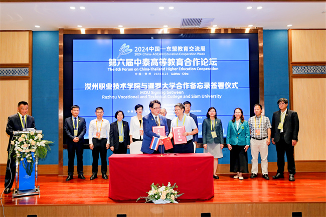8月23日,主題為“深化大學(xué)高質(zhì)量合作,攜手培養(yǎng)國(guó)際化人才”第六屆中泰高等教育合作論壇”在貴安新區(qū)的中國(guó)—東盟教育交流周永久會(huì)址二樓斗篷山廳召開。本次論壇由江蘇大學(xué)、貴州大學(xué)、貴陽學(xué)院、東西方國(guó)際教育與中泰高等教育合作聯(lián)盟聯(lián)合主辦,吸引了來自中泰兩國(guó)20余所知名學(xué)府的80多位代表齊聚一堂。汝州職業(yè)技術(shù)學(xué)院劉延賓與泰國(guó)暹羅大學(xué)校長(zhǎng)蓬猜博士共同簽署“MOU合作備忘錄”。