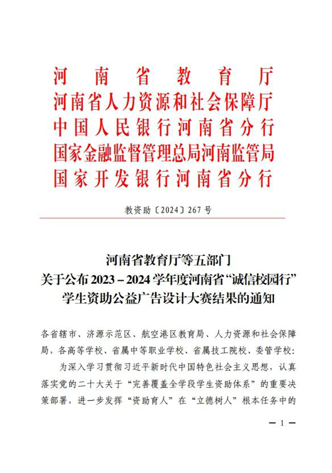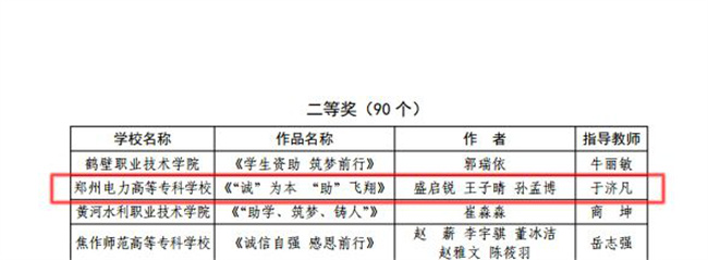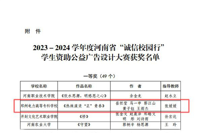 鄭州電力高等?茖W(xué)校榮獲河南省“誠(chéng)信校園行”學(xué)生資助公益廣告設(shè)計(jì)大賽一等獎(jiǎng)