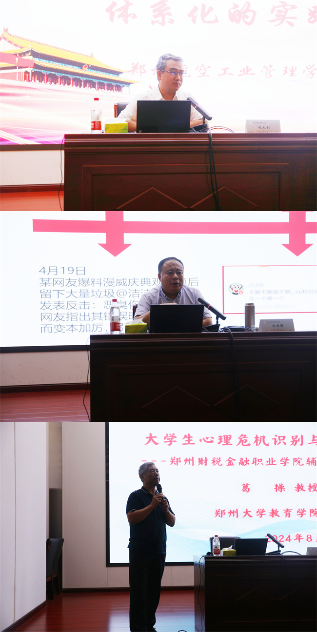 本次輔導員培訓,該校邀請了多位省內外知名專家,鄭州航空工業(yè)管理學院商學院黨委副書記倪大釗為我們揭示了新時代高校二級學院學生工作體系化的新路徑與新探索;遼寧生態(tài)工程職業(yè)學院原學工部部長劉明耀深入剖析了學生日常教育管理中的潛在危機與應對策略;中國心理學會注冊系統(tǒng)臨床督導師、鄭州大學教育學院心理學系教授葛操以“大學生心理危機的識別與穩(wěn)定化干預技術”為主題,深入剖析了當前高校大學生心理健康的發(fā)展態(tài)勢,全面剖析了大學生常見的心理問題及其成因。