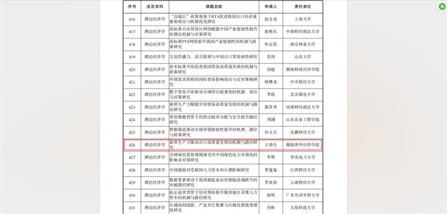 中新河南網(wǎng)9月18日電 2024年9月14日,全國(guó)哲學(xué)社會(huì)科學(xué)工作辦公室發(fā)布了《關(guān)于2024年國(guó)家社會(huì)科學(xué)基金年度項(xiàng)目立項(xiàng)名單的公示》。湖南涉外經(jīng)濟(jì)學(xué)院商學(xué)院王濤生教授主持的《新質(zhì)生產(chǎn)力驅(qū)動(dòng)出口高質(zhì)量發(fā)展的機(jī)制與路徑研究》項(xiàng)目脫穎而出,成功獲批立項(xiàng),該校也成為2024年度湖南省內(nèi)唯一一所獲批此類項(xiàng)目的民辦本科院校。至此,改校已累計(jì)獲批國(guó)家社會(huì)科學(xué)基金項(xiàng)目4項(xiàng)。