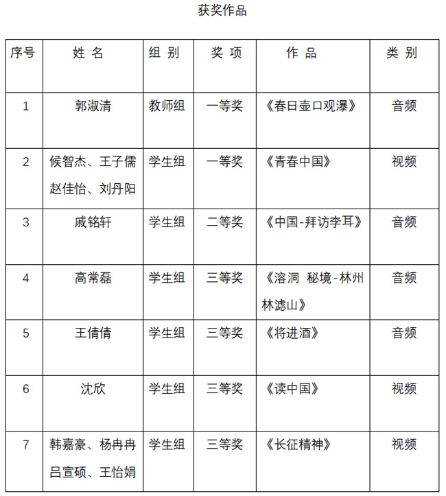 此項(xiàng)活動(dòng)是河南測(cè)繪職業(yè)學(xué)院“4.23”讀書月重點(diǎn)工作,也是該校圖書館連續(xù)五屆承辦該活動(dòng)校賽,經(jīng)過(guò)精心組織,多渠道廣泛宣傳,在師生中引起熱烈反響,校賽中遴選的優(yōu)秀作品在省賽中均斬獲佳績(jī),再創(chuàng)歷史新高。其中,郭淑清音頻作品《春日壺口觀瀑》喜獲教師組一等獎(jiǎng),候智杰、王子儒、趙佳怡、劉丹陽(yáng)視頻作品《青春中國(guó)》喜獲學(xué)生組一等獎(jiǎng)。這些成績(jī)的獲得不僅是對(duì)學(xué)校師生朗讀才華的肯定,也是對(duì)學(xué)校教育教學(xué)質(zhì)量和校園文化建設(shè)的認(rèn)可。