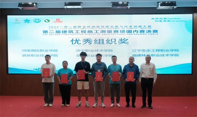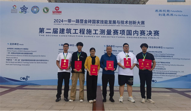 中新河南網(wǎng)10月1日電(孫樹芳) 9月23日,2024一帶一路暨金磚國家技能發(fā)展與技術(shù)創(chuàng)新大賽建筑工程施工測量賽項(xiàng)(高職組)決賽在江西應(yīng)用職業(yè)技術(shù)學(xué)院圓滿落幕,來自25個(gè)省市65所高職院校的120支參賽隊(duì)伍240名選手同場比拼,河南測繪職業(yè)學(xué)院由測繪工程系書記賴學(xué)軍帶隊(duì)參加該項(xiàng)比賽。在為期3天共3個(gè)項(xiàng)目的激烈角逐中,該校參賽團(tuán)隊(duì)(由王建設(shè)、周榮、孫樹芳、李俊寶擔(dān)任指導(dǎo)教師,羅通、張宏達(dá)、王帥昌、高登科作為參賽選手)克服困難、沉著應(yīng)戰(zhàn),榮獲二等獎1項(xiàng)、三等獎1項(xiàng),周榮、李俊寶兩位老師榮獲優(yōu)秀指導(dǎo)老師,學(xué)校榮獲優(yōu)秀組織獎。