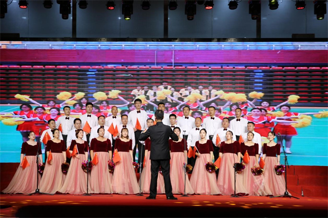 當(dāng)晚,大學(xué)生活動(dòng)中心燈光璀璨、氣氛喜慶。比賽在機(jī)關(guān)合唱二隊(duì)與繼續(xù)教育學(xué)院合唱隊(duì)帶來(lái)的歌曲《東方紅》中拉開(kāi)帷幕。比賽中,全校11支參賽隊(duì)以昂揚(yáng)的精神、飽滿的熱情、恢弘的氣勢(shì)、整齊的隊(duì)列先后登場(chǎng)。《沒(méi)有共產(chǎn)黨就沒(méi)有新中國(guó)》《我和我的祖國(guó)》《今天是你的生日》《祖國(guó)不會(huì)忘記》《我們走在大路上》《團(tuán)結(jié)就是力量》《愛(ài)我中華》《保衛(wèi)黃河》等一首首歌曲被飽含深情地演繹,時(shí)而昂揚(yáng)激越、時(shí)而低沉傾訴、時(shí)而鏗鏘有力,唱出了鄭職院教職工對(duì)祖國(guó)的無(wú)限熱愛(ài),唱出了一心向黨砥礪前行的熾熱情懷,抒發(fā)了鄭職院教職工為黨育人、為國(guó)育才的堅(jiān)定決心和向著國(guó)家一流高水平高職院校闊步前行的堅(jiān)定信心。