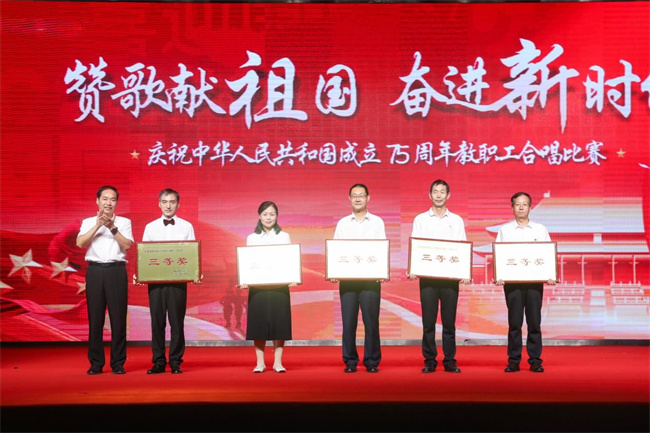 75年櫛風(fēng)沐雨,75年高歌奮進(jìn)。整場(chǎng)比賽氣氛熱烈,高潮迭起,現(xiàn)場(chǎng)時(shí)時(shí)響起熱烈的掌聲。經(jīng)過(guò)激烈角逐,機(jī)關(guān)合唱一隊(duì)、文化創(chuàng)意學(xué)院和建筑與環(huán)境工程學(xué)院合唱隊(duì)榮獲一等獎(jiǎng);自動(dòng)化與物聯(lián)網(wǎng)學(xué)院和信息工程與大數(shù)據(jù)學(xué)院合唱隊(duì)、軌道交通工程學(xué)院和生命健康學(xué)院合唱隊(duì)、新能源汽車學(xué)院合唱隊(duì)、財(cái)經(jīng)與金融管理學(xué)院和新材料工程學(xué)院合唱隊(duì)榮獲二等獎(jiǎng);機(jī)關(guān)合唱二隊(duì)和繼續(xù)教育學(xué)院合唱隊(duì)、馬克思主義學(xué)院合唱隊(duì)、智能制造學(xué)院合唱隊(duì)、電子商務(wù)學(xué)院合唱隊(duì)、體育學(xué)院合唱隊(duì)榮獲三等獎(jiǎng)。黨委宣傳部、校工會(huì)榮獲優(yōu)秀組織獎(jiǎng),校團(tuán)委、文化創(chuàng)意學(xué)院榮獲突出貢獻(xiàn)獎(jiǎng)。