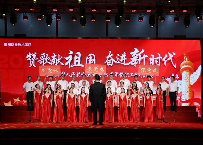中新河南網(wǎng)10月1日電 贊歌獻祖國、奮進新時代。9月29日晚,鄭州職業(yè)技術(shù)學院在大學生活動中心舉辦慶祝中華人民共和國成立75周年教職工合唱比賽。學校黨委書記呂村、校長潘維成、黨委副書記肖世才、副校長張建偉、工會主席王桂麗、副校長王少華、紀委書記楊挺出席活動,與全校教職工歡聚一堂,共同謳歌新中國成立75年來的輝煌歷程,共同祝福偉大祖國繁榮昌盛。
