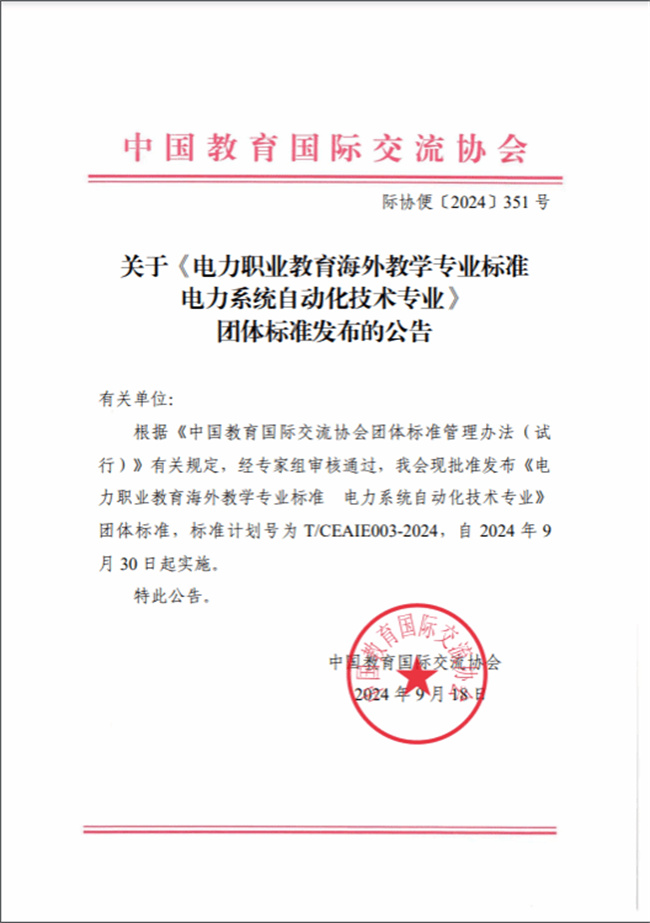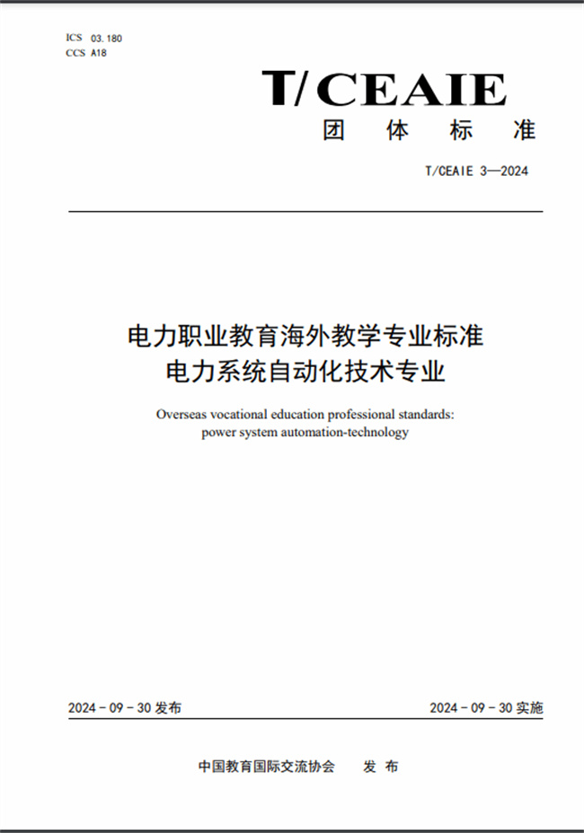 中新河南網(wǎng)10月10日電(黃詩雅) 近日,鄭州電力高等?茖W(xué)校牽頭制訂的《電力職業(yè)教育海外教學(xué)專業(yè)標(biāo)準(zhǔn)--電力系統(tǒng)自動化技術(shù)專業(yè)團(tuán)體標(biāo)準(zhǔn)》獲中國教育國際交流協(xié)會批準(zhǔn)發(fā)布,標(biāo)準(zhǔn)計(jì)劃號為T/CEAIE003-2024,并于2024年9月30日起正式實(shí)施。