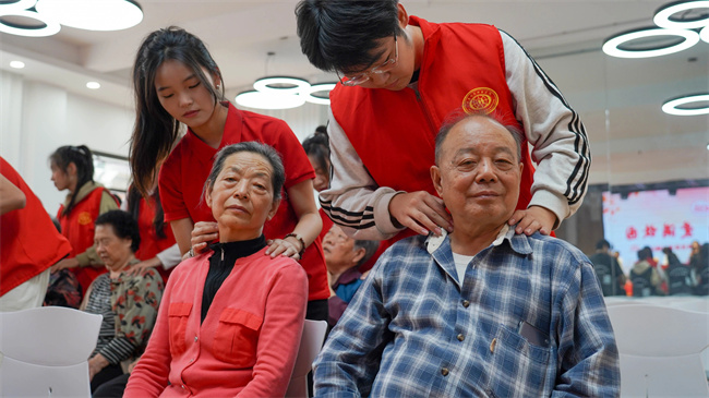 體育系組織師生為退休教師表演二十四式太極養(yǎng)生操,并由體育系教師講解秋冬季節(jié)的保健養(yǎng)生知識。同時,學生志愿者們熱情為退休教師進行康養(yǎng)按摩,沉浸式的互動體驗,讓在場的師生們感受頗深。