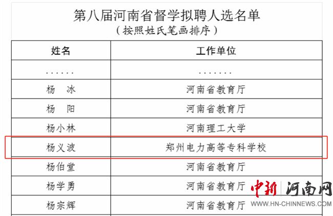 中新河南網(wǎng)11月9日電(姚夢偉) 日前,河南省教育廳公布了第八屆河南省督學擬聘人選名單,鄭州電力高等專科學校黨委書記楊義波教授名列其中。