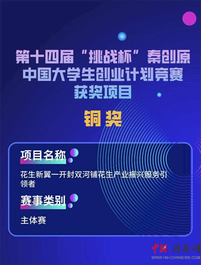 據(jù)悉,第十四屆“挑戰(zhàn)杯”秦創(chuàng)原中國(guó)大學(xué)生創(chuàng)業(yè)計(jì)劃競(jìng)賽由共青團(tuán)中央、教育部、人力資源社會(huì)保障部、中國(guó)科協(xié)、全國(guó)學(xué)聯(lián)、陜西省人民政府聯(lián)合主辦,由西安交通大學(xué)、共青團(tuán)陜西省委承辦共吸引來自2700余所高校的300多萬名學(xué)生參與,累計(jì)提交39萬余個(gè)創(chuàng)新創(chuàng)業(yè)項(xiàng)目。開封文化藝術(shù)職業(yè)學(xué)院《花生新翼——開封雙河鋪花生產(chǎn)業(yè)振興服務(wù)引領(lǐng)者》項(xiàng)目突出重圍,入圍全國(guó)決賽并斬獲銅獎(jiǎng)。