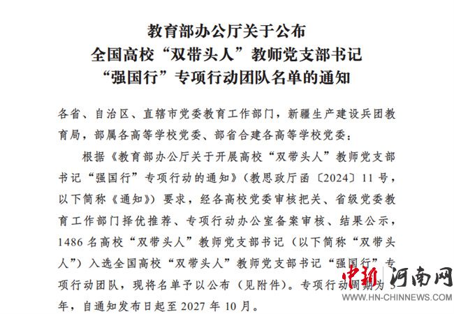 據(jù)悉,此次高校“雙帶頭人”教師黨支部書記“強(qiáng)國行”專項行動,經(jīng)基層黨組織申報、學(xué)校黨委審核把關(guān)、省級黨委教育工作部門擇優(yōu)推薦、專項行動辦公室備案審核,共遴選產(chǎn)生1486個高校“雙帶頭人”教師黨支部書記“強(qiáng)國行”專項行動團(tuán)隊,旨在創(chuàng)新落實(shí)立德樹人根本任務(wù),深入貫徹落實(shí)教育部黨組關(guān)于高校“雙帶頭人”教師黨支部書記培育工作的部署要求,引導(dǎo)廣大師生在以中國式現(xiàn)代化全面推進(jìn)強(qiáng)國建設(shè)、民族復(fù)興偉業(yè)新征程上砥礪新?lián)?dāng)、展現(xiàn)新作為。(黃河水利職業(yè)技術(shù)學(xué)院供稿)