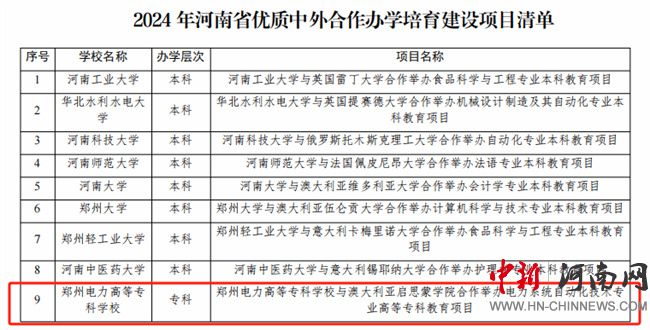 鄭州電力高等?茖W(xué)校入選2024年河南省優(yōu)質(zhì)中外合作辦學(xué)培育建設(shè)項目