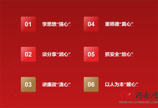 新鄉(xiāng)職業(yè)技術(shù)學(xué)院將對(duì)教育的博愛化成“六心”工程。即學(xué)思想“強(qiáng)心”、談分享“潤心”、講廉政“清心”、重師德“真心”、抓安全“放心”、以人為本“暖心”。在教師隊(duì)伍建設(shè)中,學(xué)校深度融入“六心”工程于日常。以強(qiáng)心堅(jiān)守教育信念,以潤心關(guān)愛學(xué)生成長,以清心恪守師德規(guī)范,以真心永葆師德師風(fēng),以安心抓好校園安全,以暖心鑄就教育輝煌,大思政氛圍漸濃,育人無聲。