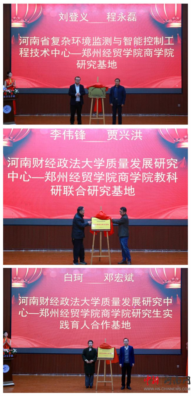 隨后,河南省復(fù)雜環(huán)境監(jiān)測與智能控制工程技術(shù)中心—鄭州經(jīng)貿(mào)學(xué)院商學(xué)院研究基地、河南財(cái)經(jīng)政法大學(xué)質(zhì)量發(fā)展研究中心—鄭州經(jīng)貿(mào)學(xué)院商學(xué)院教科研聯(lián)合研究基地、河南財(cái)經(jīng)政法大學(xué)質(zhì)量發(fā)展研究中心—鄭州經(jīng)貿(mào)學(xué)院商學(xué)院研究生實(shí)踐育人合作基地順利揭牌。