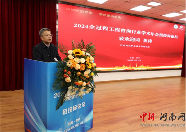 河南建筑職業(yè)技術(shù)學(xué)院校長(zhǎng)焦?jié)職g迎詞,向參加論壇的各位領(lǐng)導(dǎo)、嘉賓致以最熱烈的歡迎和最誠(chéng)摯的問(wèn)候。他表示,期待通過(guò)本次論壇,能夠匯聚各方力量,激發(fā)更多思想火花,共同探索招投標(biāo)領(lǐng)域的新趨勢(shì)、新挑戰(zhàn)與新機(jī)遇,為推動(dòng)全過(guò)程工程咨詢行業(yè)的繁榮發(fā)展,乃至整個(gè)建筑行業(yè)的轉(zhuǎn)型升級(jí)注入新的活力與動(dòng)力。
