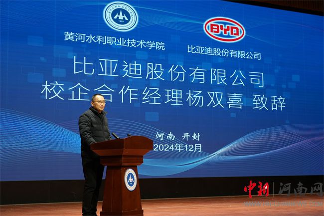 楊雙喜在致辭中介紹了比亞迪股份有限公司的概況,以及在新能源汽車領(lǐng)域取得的成就。他表示,比亞迪將發(fā)揮企業(yè)優(yōu)勢,整合優(yōu)質(zhì)資源,與黃河水利職業(yè)技術(shù)學院在現(xiàn)場工程師學院建設(shè)方面共同探索,凝聚育人合力,構(gòu)建長效合作機制,在專業(yè)建設(shè)、教學標準制定、教材開發(fā)和人才共育等方面,助力學校高質(zhì)量發(fā)展,助力學生高質(zhì)量就業(yè),全流程服務(wù)培養(yǎng)新能源汽車產(chǎn)業(yè)鏈的人才。