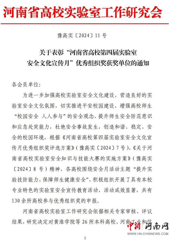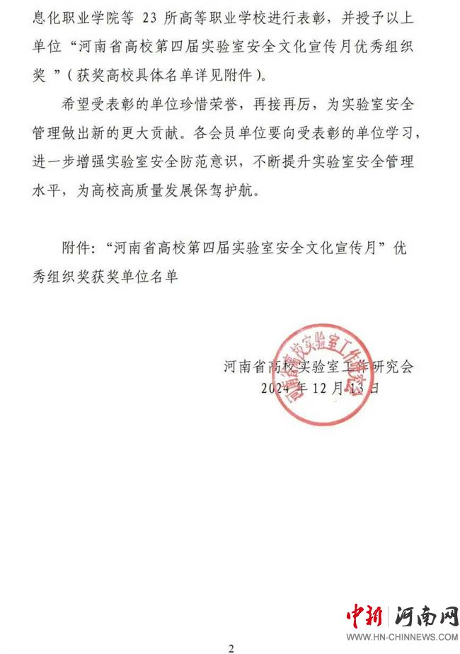 中新河南網(wǎng)12月24日電 近日,河南省高校第四屆實(shí)驗(yàn)室安全文化宣傳月活動評選結(jié)果揭曉,黃河水利職業(yè)技術(shù)學(xué)院連續(xù)四年榮獲“優(yōu)秀組織獎(jiǎng)”。