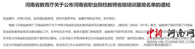 中新河南網(wǎng)12月26日電(王曉雯) 12月24日,河南省教育廳公布了《關(guān)于公布河南省職業(yè)院校教師省級培訓基地名單的通知》,河南測繪職業(yè)學院順利通過遴選,成功獲批為河南省職業(yè)院校“雙師型”教師培訓基地。
