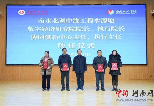 董聯(lián)軍代表學(xué)校正式聘任南陽師范學(xué)院經(jīng)濟與管理學(xué)院院長姜長寶為南水北調(diào)中線工程水源地數(shù)字經(jīng)濟研究院院長、南陽職業(yè)學(xué)院商學(xué)院院長余娟為執(zhí)行院長,南水北調(diào)中線水源區(qū)水安全協(xié)同創(chuàng)新中心主任何俊寶為協(xié)同創(chuàng)新中心主任、南陽職業(yè)學(xué)院發(fā)展規(guī)劃處處長萬樂為執(zhí)行主任。