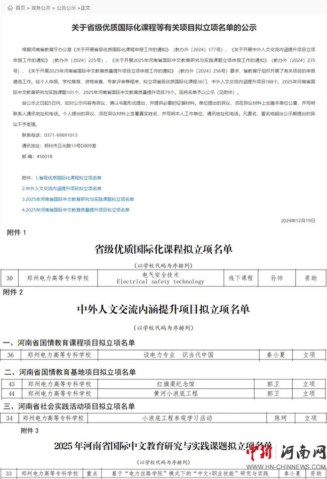 中新河南網12月28日電(石亦軒) 日前,河南省教育廳對省級優(yōu)質國際化課程等有關項目立項名單進行了公布,鄭州電力高等專科學校申報的6項項目喜獲立項。其中,省級優(yōu)質國際化課程1門,國情教育課程項目1個、國情教育基地項目2個、社會實踐活動項目1個,省國際中文教育研究與實踐重點課題1個。