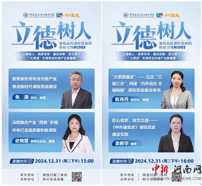 中新河南網1月2日電 12月31日下午3點,河南建筑職業(yè)技術學院以“立德樹人,筑夢未來,融合創(chuàng)新,匠心育才:‘大思政’引領專業(yè)對接產業(yè)新篇章”為主題的系列直播課正式上線新華網“新華思政”平臺。直播課由校長焦?jié)髦v,副校長趙肖丹等名師團隊精心打造。
