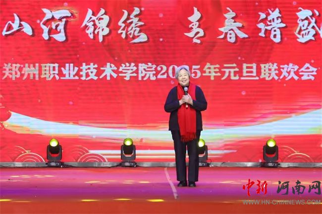 鄭州職業(yè)技術(shù)學(xué)院原副校長(zhǎng)周慧玲在學(xué)校元旦聯(lián)歡會(huì)現(xiàn)場(chǎng)為全校師生送上祝福并表演詩(shī)朗誦《沁園春·長(zhǎng)沙》