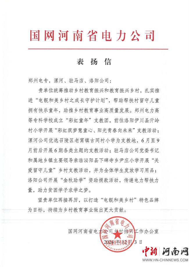 中新河南網(wǎng)1月3日電(王宣衡) 近日,國(guó)網(wǎng)河南省電力公司通報(bào)表?yè)P(yáng)鄭州電力高等?茖W(xué)校成立“彩虹童年”支教團(tuán),前往洛陽(yáng)伊川縣亓嶺村小學(xué)開(kāi)展“彩虹筑夢(mèng)慧童心、陽(yáng)光青春向未來(lái)”支教活動(dòng),對(duì)鄭州電力高等?茖W(xué)校校地結(jié)對(duì)幫扶工作取得的優(yōu)異成績(jī)給予充分肯定;對(duì)鄭州電力高等?茖W(xué)校在助力伊川縣鄉(xiāng)村振興過(guò)程中,展現(xiàn)出國(guó)家電網(wǎng)大國(guó)重器責(zé)任擔(dān)當(dāng)?shù)那閼押蛧?guó)家電網(wǎng)人特別能吃苦、特別能戰(zhàn)斗、特別能奉獻(xiàn)的企業(yè)精神給予高度評(píng)價(jià)。