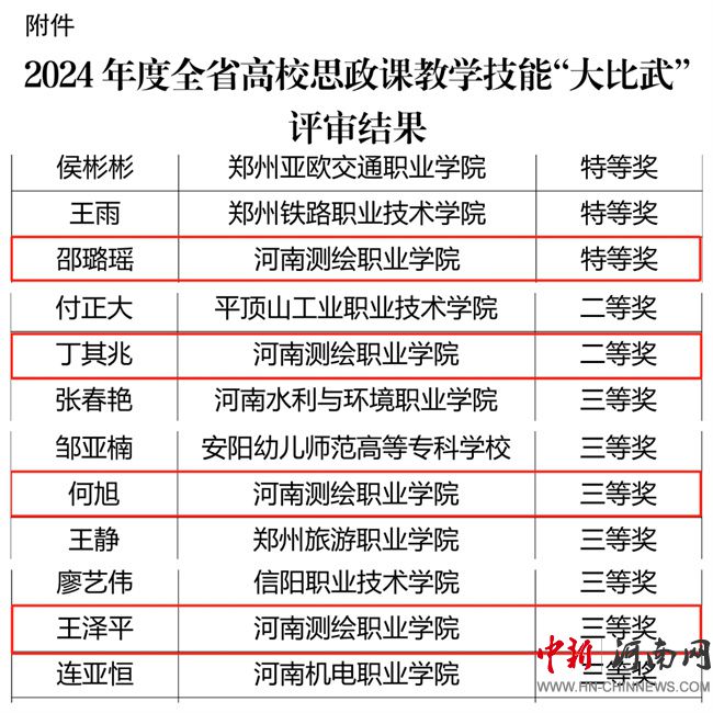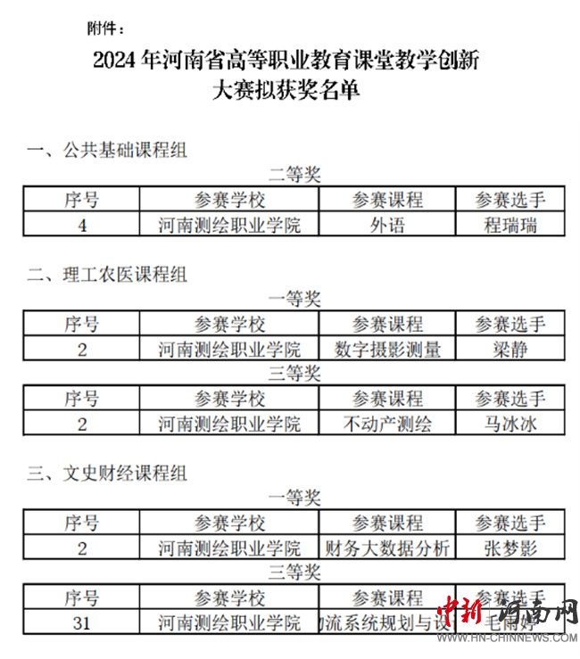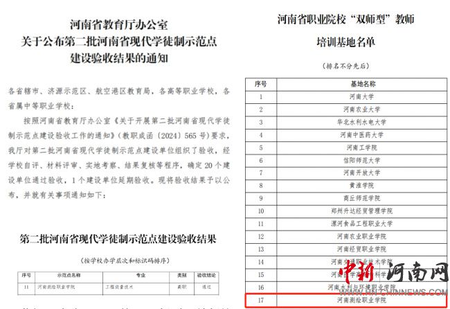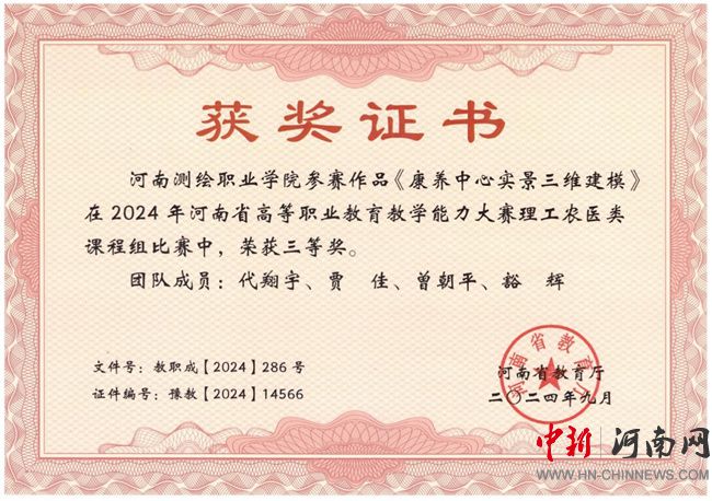 與南方測繪集團共建元宇宙智能測繪實訓中心;獲批2024年河南省職業(yè)教育示范性虛擬仿真實訓基地;四人入選首批河南省職業(yè)教育教學指導委員會;獲批河南省職業(yè)院校“雙師型”教師培訓基地。