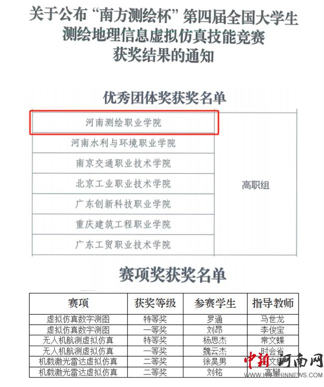 這一年,學生在國家級、省級技能競賽中表現(xiàn)優(yōu)異,共獲得一等獎17個、二等獎21個、三等獎27個。在“南方測繪杯”第四屆全國大學生測繪地理信息虛擬仿真技能競賽、“達北杯”第五屆全國大學生無人機測繪技能競賽等賽事中,河南測繪職業(yè)學院學子多次奪得特等獎,展現(xiàn)了扎實的專業(yè)技能和良好的精神風貌。