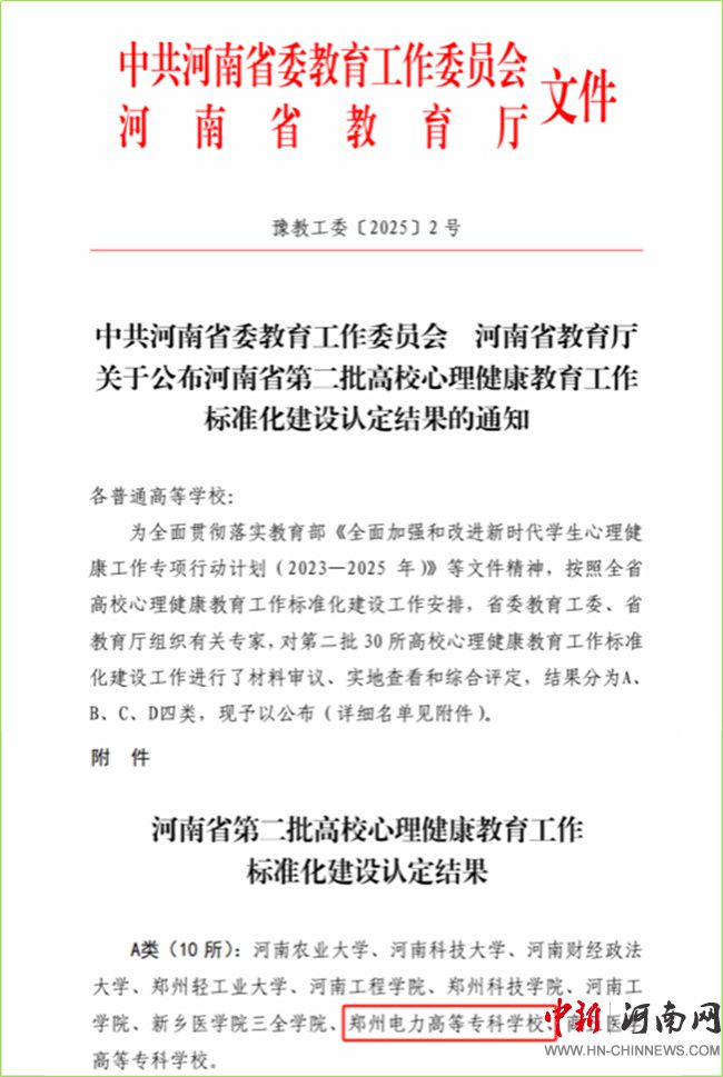 鄭州電力高等?茖W校心理健康教育工作扎實開展,并成功探索出具有高職教育特色的心理育人路徑,顯著提升學生心理健康水平,有效減少心理危機事件的發(fā)生率,先后獲得河南省高校心理健康教育名師工作室、河南省高校大學生心理健康教育優(yōu)秀課程、河南省高校大學生心理危機干預優(yōu)秀案例等榮譽。