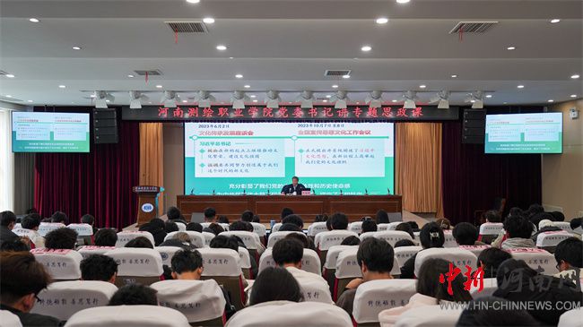 中新河南網(wǎng)3月5日電(何旭/文 鄭嶸淇/圖) 2月28日下午,河南測繪職業(yè)學(xué)院黨委書記張樹嶺在多功能報(bào)告廳講授題為《加快建設(shè)社會主義文化強(qiáng)國》的專題思政課。全體思政課教師以及部分學(xué)生代表聆聽學(xué)習(xí)。