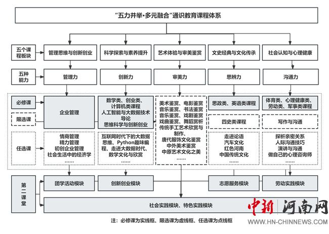 圍繞管理力、創(chuàng)新力、審美力、思辨力、溝通力這五大核心能力,精心設(shè)置系列課程與實(shí)踐活動(dòng),打破了傳統(tǒng)專業(yè)教育與通識(shí)教育之間的界限,強(qiáng)調(diào)“多元融合”,將人文社科、自然科學(xué)、藝術(shù)修養(yǎng)、商業(yè)管理以及創(chuàng)新創(chuàng)業(yè)等多個(gè)領(lǐng)域知識(shí)有機(jī)融合,形成跨學(xué)科的課程體系,拓寬學(xué)生的知識(shí)視野,激發(fā)創(chuàng)新思維,培養(yǎng)學(xué)生的綜合素質(zhì)。
