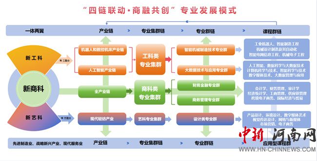 依托河南省和鄭州市重點(diǎn)產(chǎn)業(yè)鏈,面向先進(jìn)制造業(yè)、戰(zhàn)略新興產(chǎn)業(yè)、現(xiàn)代服務(wù)業(yè)三大產(chǎn)業(yè),打造工科類、商科類、藝科類三大專業(yè)集群,形成與區(qū)域產(chǎn)業(yè)高度匹配的智能機(jī)械制造技術(shù)專業(yè)群、大數(shù)據(jù)技術(shù)與應(yīng)用專業(yè)群、財(cái)務(wù)金融專業(yè)群、商務(wù)管理專業(yè)群、設(shè)計(jì)類專業(yè)群六大專業(yè)群。
