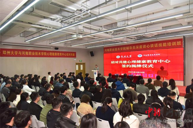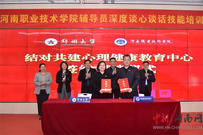 中新河南網(wǎng)3月31日電(楊麗) 3月29日下午,河南職業(yè)技術學院與鄭州大學結對共建心理健康教育中心簽約揭牌儀式在河職創(chuàng)新港舉行。鄭州大學黨委副書記王利國、河南職院黨委書記厲勵出席簽約儀式并致辭。校黨委副書記、工會主席田華主持簽約儀式。校黨委委員、副校長任楓軒,鄭州大學黨委學生工作部部長冀娟、大學生心理健康中心主任劉慧瀛參加。