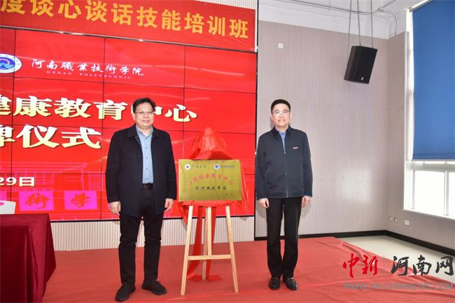 河南職業(yè)技術學院黨委書記厲勵與鄭州大學黨委副書記王利國共同為心理健康教育中心揭牌