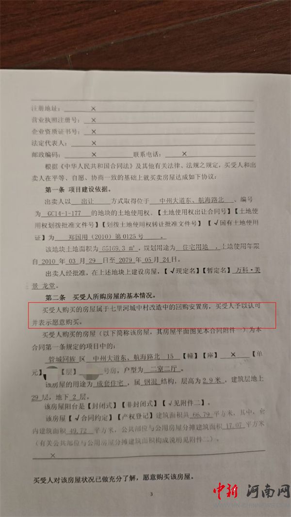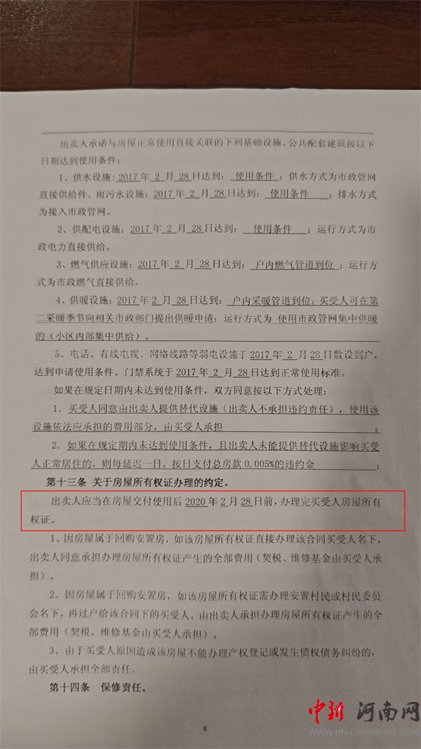 根據(jù)業(yè)主提供的原始購房合同,其所購入的15號樓房屋,屬于七里河城中村改造中的回購安置房。在“關(guān)于房屋所有權(quán)證辦理的約定”一欄顯示,“出賣人應(yīng)當在房屋交付使用后2020年2月28日前,辦理完買受人房屋所有權(quán)證”。