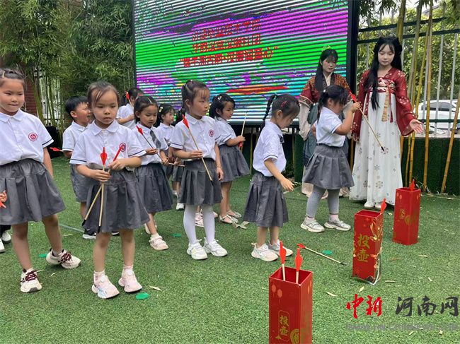 五名身著典雅漢服的社團(tuán)成員翩躚而至,通過繪聲繪色的小話劇表演,將屈原的愛國故事娓娓道來,并生動(dòng)介紹包粽子、賽龍舟等端午習(xí)俗。在妙趣橫生的投壺游戲環(huán)節(jié),社團(tuán)成員教授幼兒投壺技巧,引導(dǎo)其在傳統(tǒng)競技中體驗(yàn)古人的雅趣,鍛煉手眼協(xié)調(diào)能力。