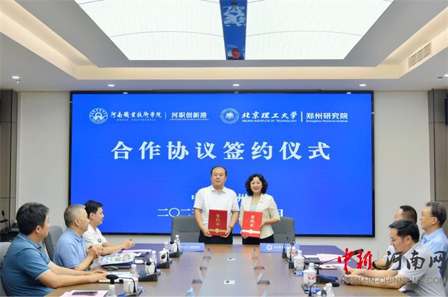 中新河南網(wǎng)6月24日電(戴磊) 6月23日上午,河南職業(yè)技術(shù)學(xué)院與北京理工大學(xué)鄭州研究院戰(zhàn)略合作協(xié)議簽約儀式在河職創(chuàng)新港舉行。北京理工大學(xué)鄭州研究院常務(wù)副院長(zhǎng)柏利、副院長(zhǎng)張學(xué)智,鄭州技術(shù)交易市場(chǎng)運(yùn)營(yíng)負(fù)責(zé)人、鄭州中原科技成果轉(zhuǎn)化有限公司總經(jīng)理車中銳,河南職業(yè)技術(shù)學(xué)院黨委書(shū)記厲勵(lì),黨委副書(shū)記、校長(zhǎng)夏新顏出席會(huì)議。雙方相關(guān)部門(mén)和科研平臺(tái)負(fù)責(zé)人參加會(huì)議。河南職業(yè)技術(shù)學(xué)院黨委委員、副校長(zhǎng)任楓軒主持儀式。