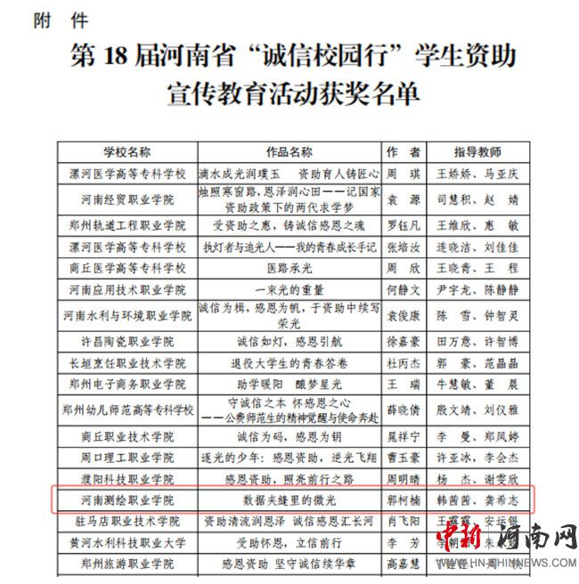中新河南網(wǎng)7月8日電(梁楚楚) 近日,河南省教育廳、河南省財政廳、中國人民銀行河南省分行、國家金融監(jiān)督管理總局河南監(jiān)管局、國家開發(fā)銀行河南省分行聯(lián)合主辦的“誠信校園行”學生資助宣傳教育比賽結(jié)果公布。河南測繪職業(yè)學院學生郭柯楠的作品《數(shù)據(jù)夾縫里的微光》(指導老師:韓茜茜、龔希志)榮獲大賽三等獎。